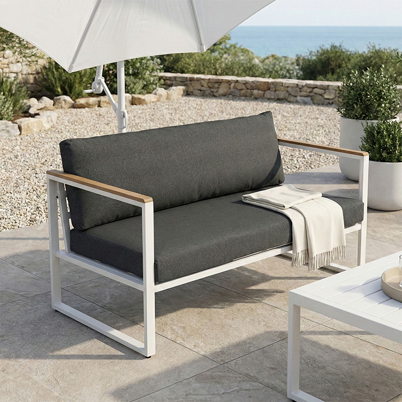 Αναβαθμίστε τον εξωτερικό ή εσωτερικό σας χώρο με τον 2θέσιο καναπέ Aurelio. Με στιβαρό ατσάλινο σκελετό και κομψές, μοντέρνες γραμμές, συνδυάζει στυλ, άνεση και μακροχρόνια αντοχή. Τα μπράτσα με επένδυση plywood προσθέτουν μια φυσική πινελιά, ενώ τα πλούσια μαξιλάρια εξασφαλίζουν μια premium εμπειρία καθίσματος.