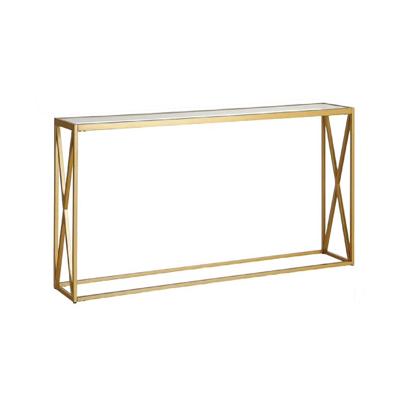 Ένα κομψό και σύγχρονο έπιπλο που συνδυάζει την λειτουργικότητα με την αισθητική. Η γυάλινη επιφάνεια προσφέρει μια αίσθηση πολυτέλειας και αντοχής, ενώ ο μεταλλικός σκελετός από χρυσό προσθέτει μια πινελιά λάμψης και εκλέπτυνσης. Οι καθαρές γραμμές και το γεωμετρικό σχέδιο του δημιουργούν ένα κομψό και διαχρονικό αισθητικό αποτέλεσμα. Ιδανική για να τοποθετηθεί σε διάδρομο, σαλόνι ή υπνοδωμάτιο, προσθέτοντας μια νότα πολυτέλειας σε κάθε χώρο.