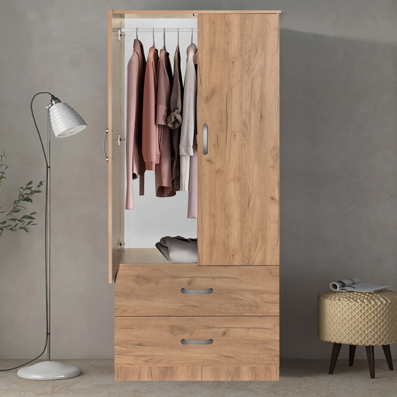 Ντουλάπα ρούχων δίφυλλη Zelia pakoworld με 2 συρτάρια χρώμα φυσικό 79x42x180εκ