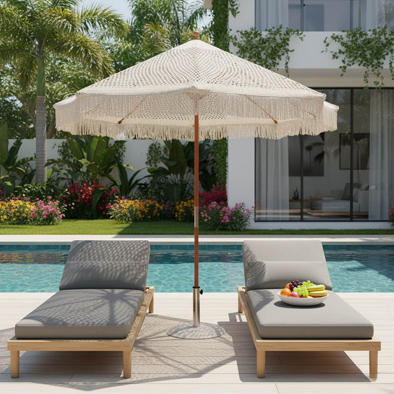 Μία ποιοτική κατασκευή με σκελετό από φυσικό ξύλο καρυδί χρώματος και με επένδυση μακραμέ σε εκρού χρωματισμό. Ιδανική να χρησιμοποιηθεί σε κήπους, παραλίες, αίθρια, καφέ, εστιατόρια και πισίνες