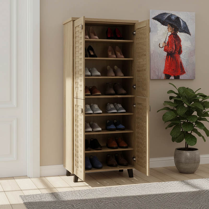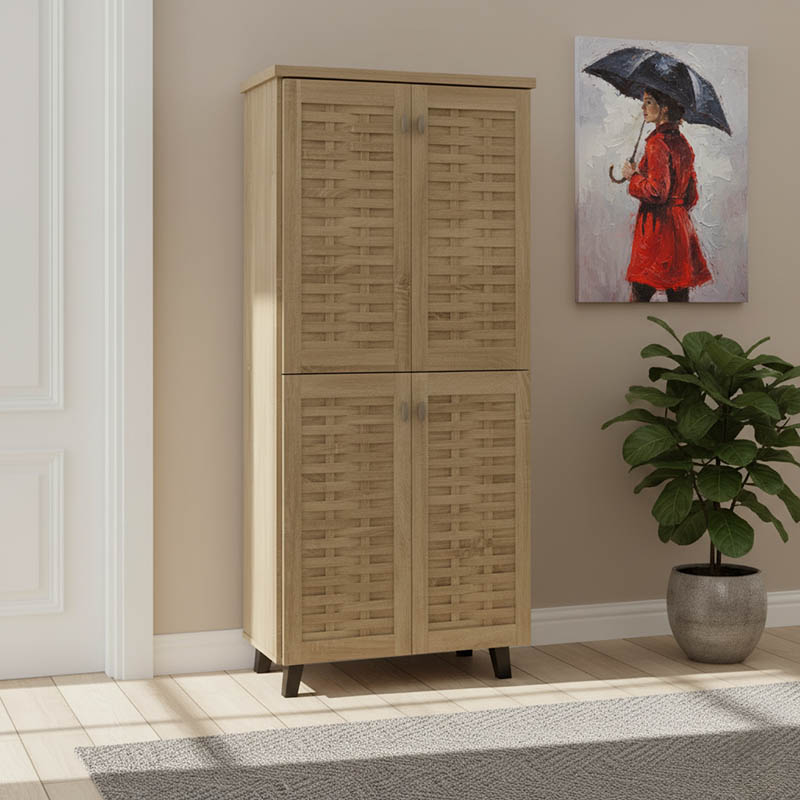 - Περιλαμβάνει τέσσερις πόρτες σε σχέδιο-μοτίβο πλέγματος, εσωτερικά φέρει επτά ράφια για 24 ζεύγη παπουτσιών, ρούχα ή αξεσουάρ.