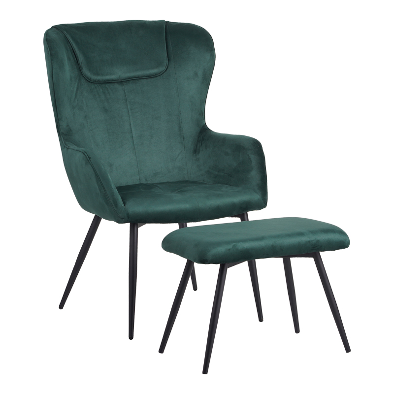 Αυτή η κομψή πολυθρόνα με το συνδυασμό του βελούδου και του μαύρου μεταλλικού σκελετού προσθέτει μια πινελιά πολυτέλειας σε κάθε χώρο. Το συνοδευτικό σκαμπό συμπληρώνει τέλεια το σετ και μπορεί να χρησιμοποιηθεί ως υποπόδιο ή ως επιπλέον καθιστικό. Απολάυστε την!