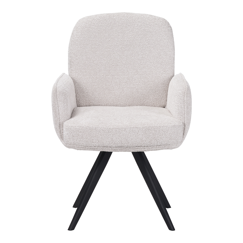 - Το κάθισμα και η πλάτη είναι επενδυμένα με ύφασμα σε μια λευκή περλέ απόχρωση που προσδίδει έναν τόνο πολυτέλειας και φωτεινότητας στον χώρο.