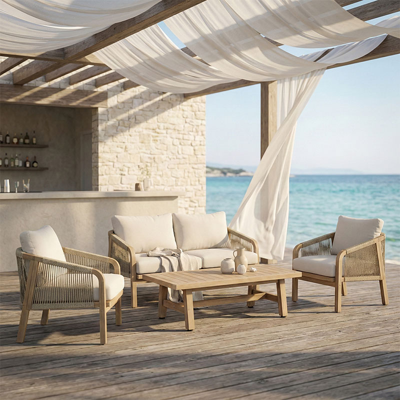 Thank you for reading this post, don't forget to subscribe!Το σαλόνι κήπου Malibu αποτελείται από ενα καναπέ διθέσιο, δυο πολυθρόνες και ένα τραπέζι. Είναι κατασκευασμένο από ανθεκτικό φυσικό ξύλο ακακίας. Είναι ένα πανέμορφο ξύλο με ιδιαίτερους χρωματισμούς και χρειάζεται σωστή συντήρηση ώστε να μην σκουραίνει το χρώμα του και να παρατείνουμε την διάρκεια ζωής του. Η φυσική και ισχυρή αντοχή του σε συνδυασμό και με την ομορφιά του το καθιστούν ιδανικό ξύλο για έπιπλα εξωτερικού χώρου καθώς είναι ανθεκτικό στο νερό και ιδανικό για σημεία που βρίσκονται σε συχνή επαφή με υγρά. Έχει τοποθετηθεί σχοινί στα πλαϊνά και στις πλάτες των πολυθρόνων, που εκπέμπει στυλ σε συνδυασμό με τις ξύλινες επιφάνειες. Μπορεί να χρησιμοποιηθεί για οικιακή και επαγγελματική χρήση.
