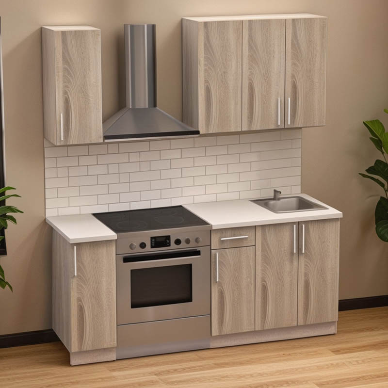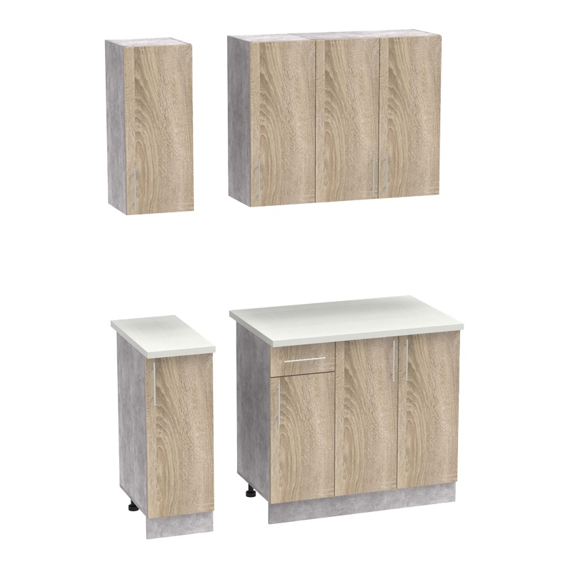 - Κάτω: Ένα διπλό ντουλάπι, ένα μονό και ένα ντουλάπι με συρτάρι