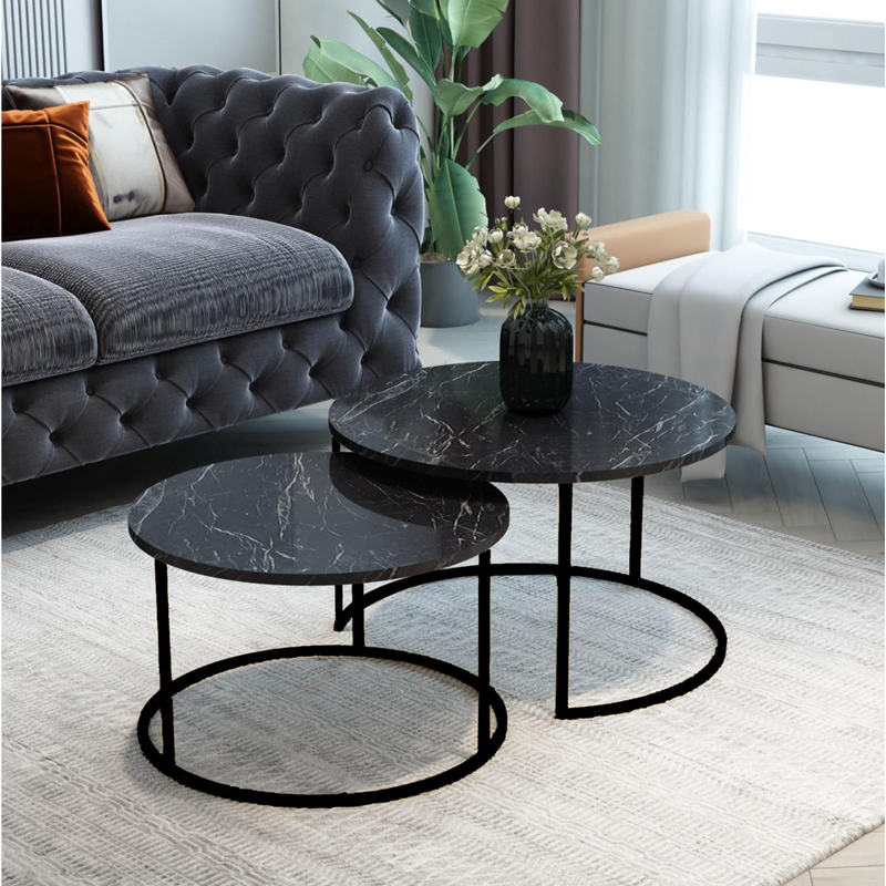 Τραπέζια σαλονιού Solme pakoworld σετ 2τεμ μαύρο μαρμάρου μελαμίνης-μαύρο μέταλλο