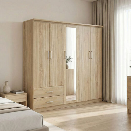 - Περιλαμβάνει δεξιά και αριστερά δύο διπλά φύλλα με εσωτερική ράγα για κρεμάστρες, το ένα κάτω έχει δύο μεγάλα συρόμενα συρτάρια, ενώ το άλλο φέρει εσωτερικό ράφι. Στο κέντρο της σύνθεσης υπάρχει στενή/μονή ντουλάπα με εξωτερικό καθρέφτη και εσωτερικά τρία ράφια. Οι ιδανικοί χώροι για την αποθήκευση ρούχων και αξεσουάρ.